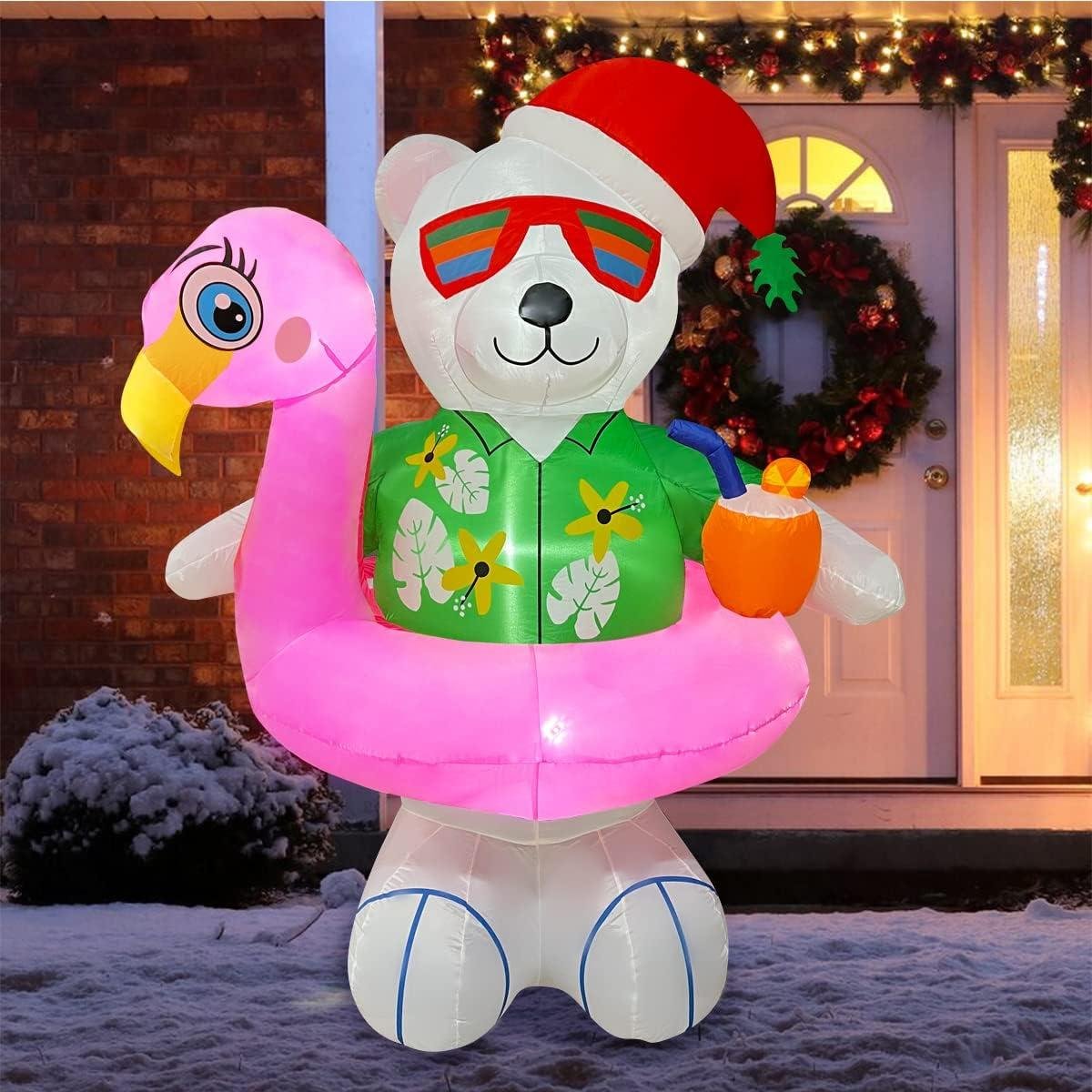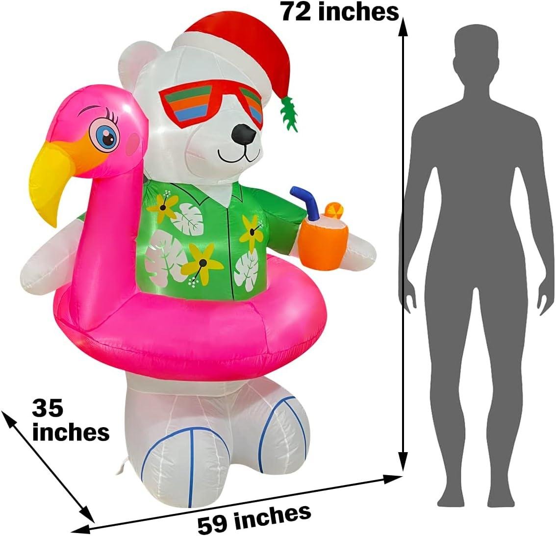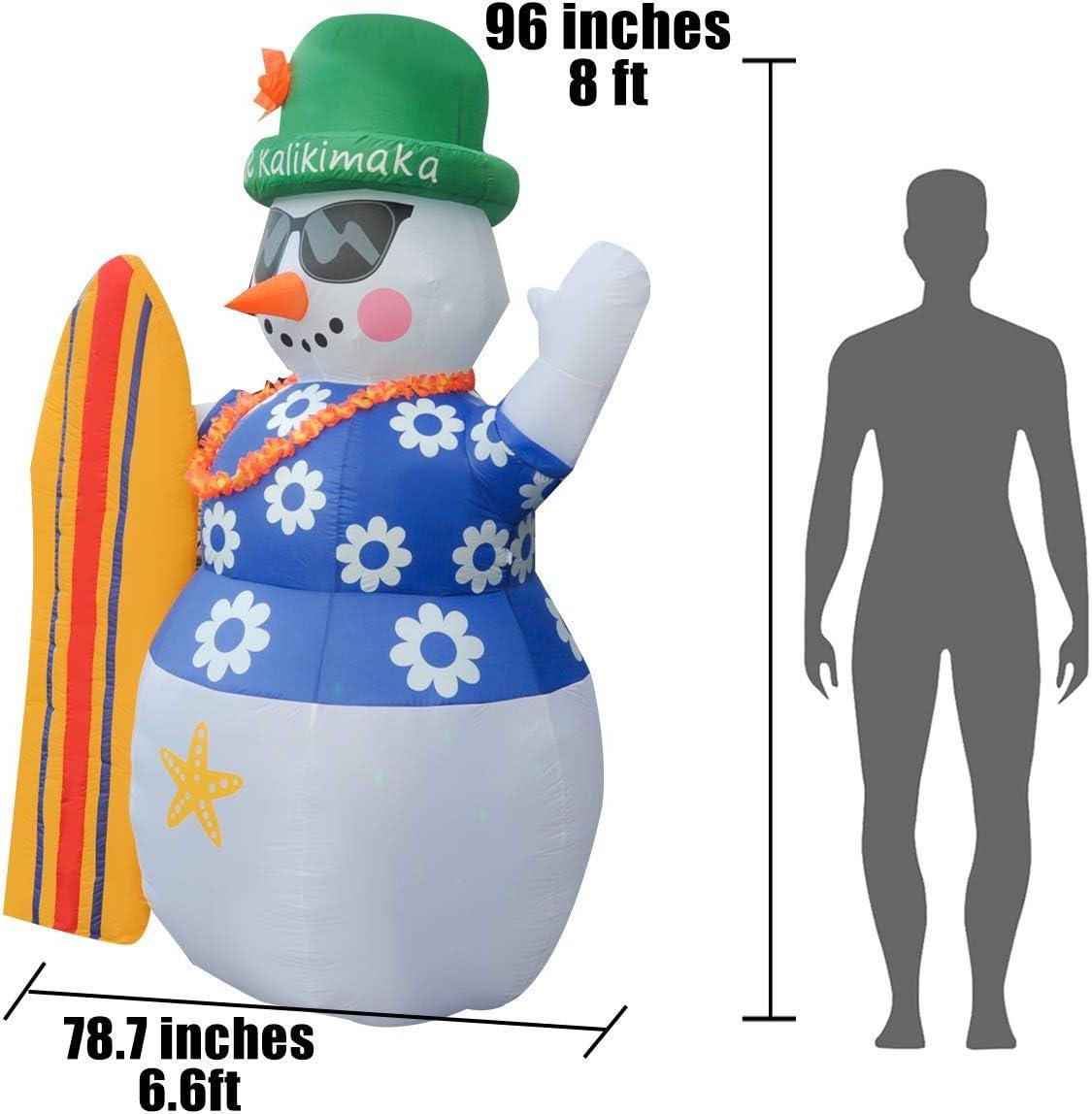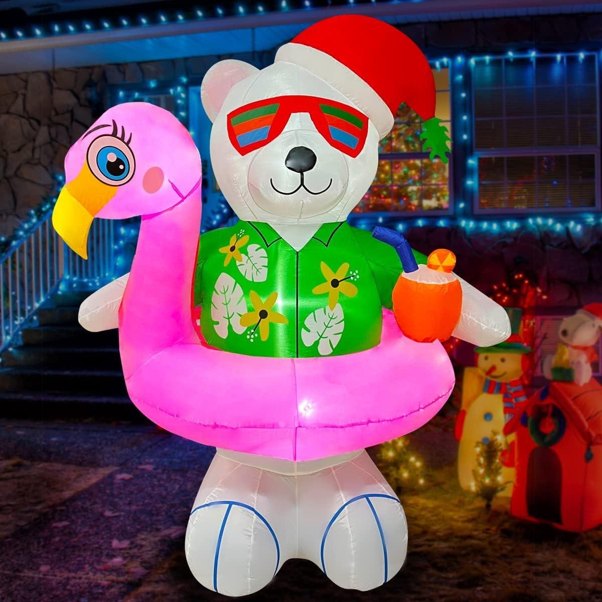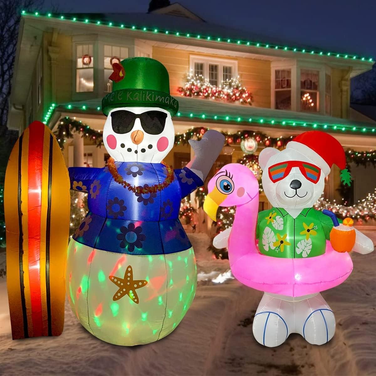 BLOWOUT FUN 8ft Inflatable Giant Christmas Hawaii Snowman with Surfboard Decoration& 6ft Christmas Inflatable Hawaiian Polar Bear with Flamingo Pool Float Decoration
