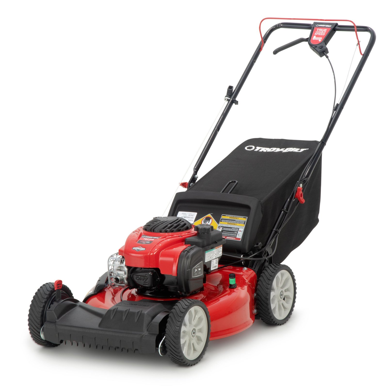 Step up the pace with the variable-speed front-wheel drive design of the Troy-Bilt TB210B lawn mower. A convenient, handle-mounted control lever is designed to adjust the mowing speed quickly as you navigate the yard. A rugged 21″ steel cutting deck has a rear bag, mulching, and side discharge options included to help keep the lawn clear of clippings and leaves. Dual-lever height adjusters quickly adjust the cutting height between 1.25″ – 3.75″ with no tools needed. The 140cc Briggs & Stratton engine is engineered for reliable power to get the job done and is equipped with ReadyStart technology for simple, no prime, no choke starting.